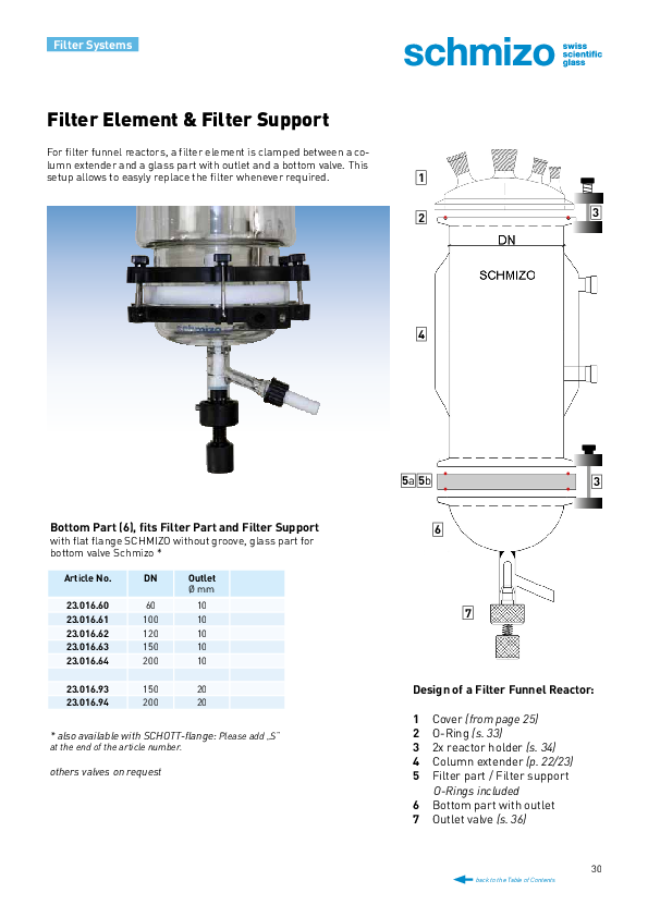 Nutsche filter - A filter element is clamped between a column (with or without heating jacket) and a separate glass section with a bottom outlet. This is a solution that will allow for the easiest exchange of the filter element.