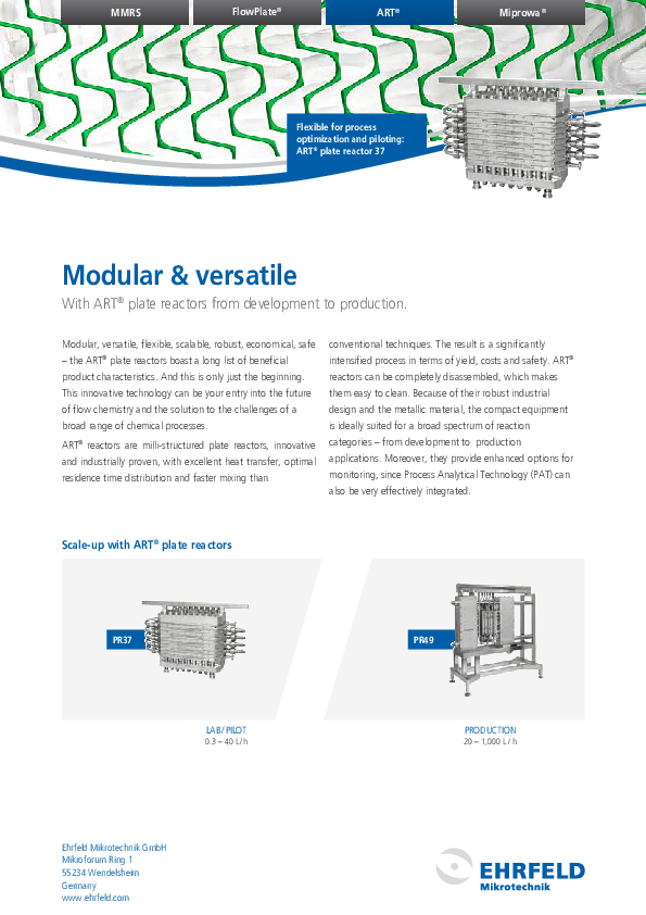 The Art® series includes the Art® Plate Reactor PR37 for laboratory and pilot scale applications and the Art® Plate Reactor PR49 for production scale.